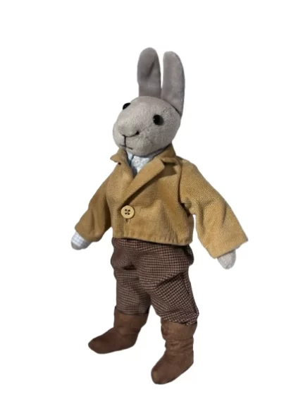 Filled with natural pine sawdust, this bunny has a comforting weight and an authentic, old-world feel. Measuring approximately 11.5 inches tall and weighing 5.3 oz, it features movable arms, legs, and head, allowing it to be gently posed in either a standing or sitting position.