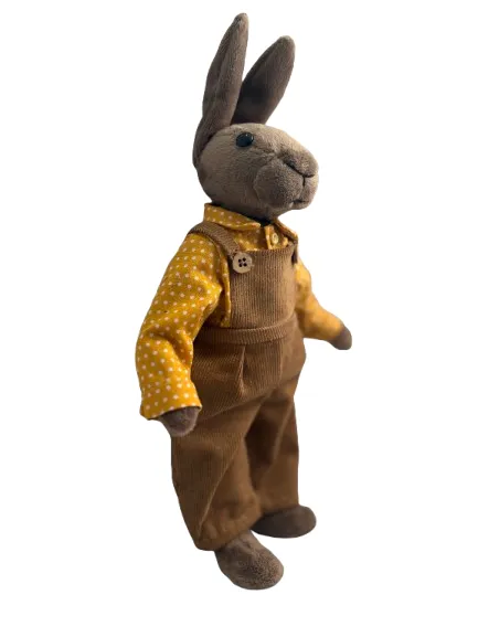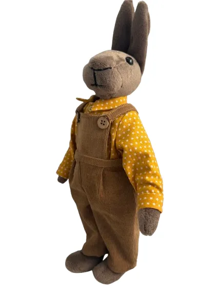 This handcrafted bunny wears a classic outfit made from thoughtfully chosen fabrics. A yellow shirt with a small white dot pattern adds gentle color without feeling overwhelming. The shirt pairs with brown corduroy-style overalls that include button details and a comfortable fit. The overall look remains practical and well suited for both play and display.