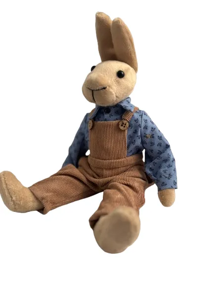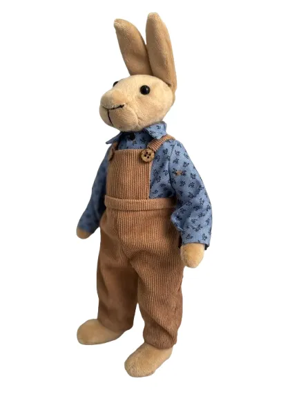 This handcrafted bunny is dressed in a coordinated outfit made from carefully selected fabrics. A blue shirt with a small repeating pattern adds subtle detail and contrast. The shirt pairs with tan corduroy-style overalls featuring button accents and a relaxed fit. The outfit feels practical and well suited for both play and display.