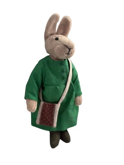 This handcrafted bunny is dressed in a solid green dress with a clean, relaxed fit. Small button details add subtle interest to the front of the dress. A fabric shoulder bag with a contrasting pattern hangs across the body, adding a practical design element without overpowering the overall look. The outfit feels functional and well suited for both play and display.