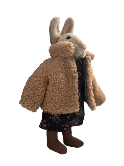 The bunny wears a textured tan coat that adds depth and interest. The coat features wooden-style buttons that give it a timeless and cozy feel. Underneath, a dark floral dress adds contrast and a touch of vintage charm. Together, these layers create a balanced and thoughtful design. In addition, the brown boots complete the outfit and give the bunny a grounded, finished look.