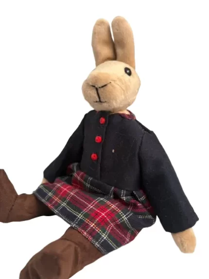 The bunny wears a timeless outfit made from carefully selected fabrics. A brown button-front jacket gives it a tailored appearance, while the subtle texture adds visual depth. Underneath, light tan trousers create balance and contrast. The outfit is finished with tall brown boots that complete the look and help the bunny stand or sit with ease. Together, these pieces create a well-coordinated style that feels both practical and charming.