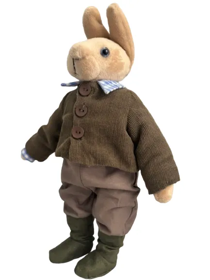 The outfit adds character while keeping a clean, traditional style. This handcrafted bunny wears a textured brown jacket with button details, paired with coordinating trousers and tall boots. A subtle collar detail adds contrast and gives the outfit a finished appearance. Together, the fabrics create a natural color palette that feels grounded and easy to style in many spaces.